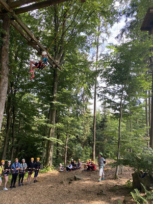 Nach den Vorübungen zeigten uns die Betreuer, wie wir uns absichern konnten. Dann ging es los: Die erste Gruppe wagte sich auf die 9 – Meter hohe Plattform. Nach einiger Zeit kam auch die zweite Gruppe mit Herrn Gramlich hinzu. Trotz Angst überwanden alle Schüler die Herausforderung.