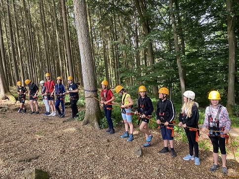 Nach der Begrüßung und einem kleinen Snack wurden uns die Sicherheitsregeln erklärt und jeder bekam einen Helm. Nun teilten wir uns in zwei Gruppen auf und machten wir uns auf den Weg, um die Vorübungen für die Höhe zu meistern. Zusammen absolvierten wir Parcours, die wir nur bestehen konnten, wenn wir zusammenhielten.
