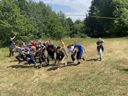 Wir wurden abgeseilt und gingen zurück zur Hütte. Nach einer weiteren Pause gingen wir zur Mutprobe des Tages. Dort erwartete uns eine 8 – Meter hohe Plattform von der wir runterspringen konnten. Nachdem alle, die wollten, gesprungen sind, spielten wir noch ein paar Spiele